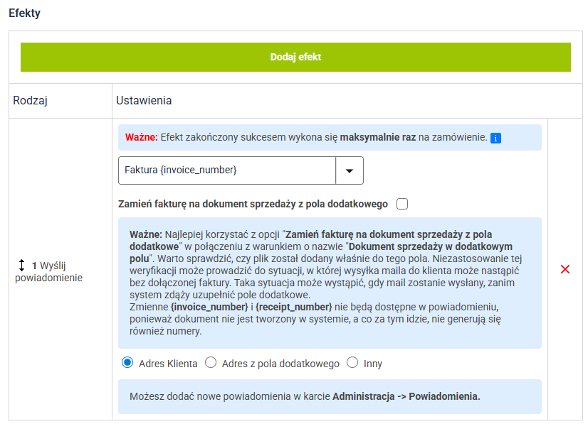 6. Po dodaniu efektu wybierz powiadomienie Faktura {invoice_number}. Treść powiadomienia edytujesz w Administracja ⇨ Powiadomienia.