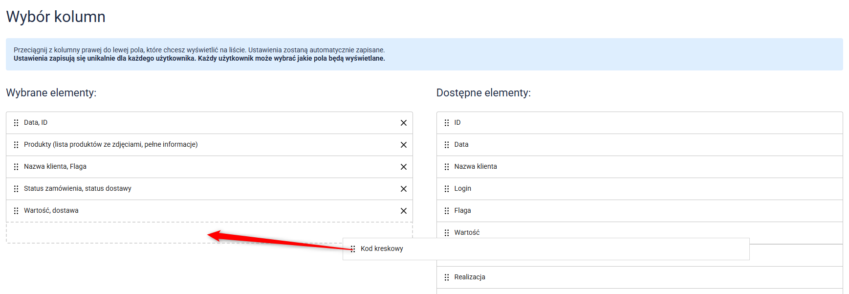 3. Przeciągnij Kod kreskowy z prawej do lewej kolumny.