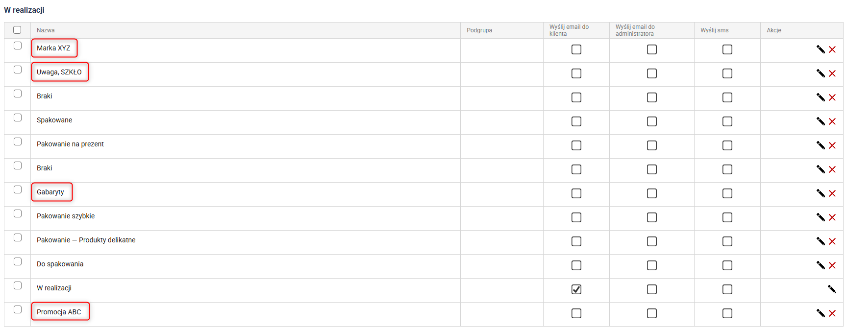 Przykład:1.Załóżmy, że w trybie pakowania chcesz rozdzielić sobie swoje zamówienia ze względu na różne kryteria. Dla przykładu utworzymy 4 grupy statusów: "MarkaXYZ", "Promocja ABC", "Gabaryt", "Uwaga szkło!"