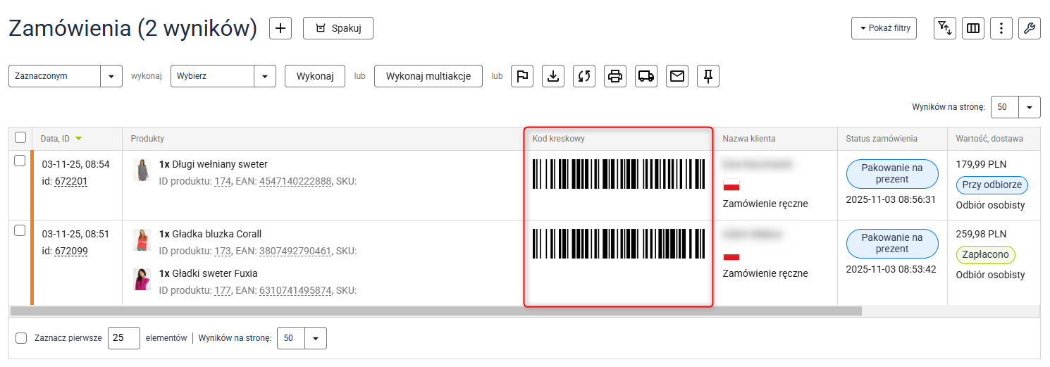 4. Zostanie wygenerowany plik z Twoimi wybranymi zamówieniami. Przy każdym zamówieniu będzie umieszczony kod kreskowy zamówienia.
