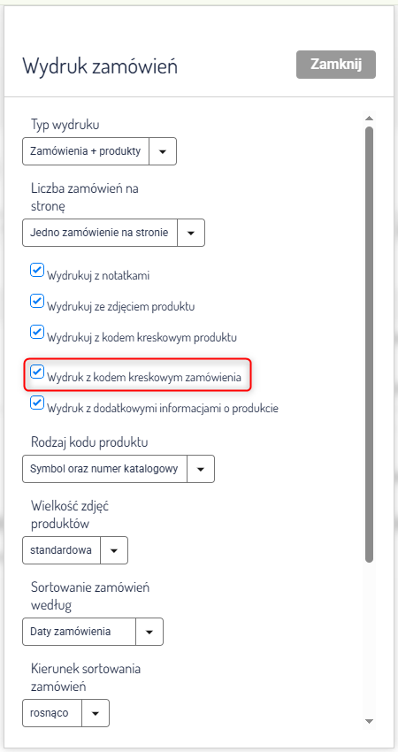 *Jeżeli chcesz, aby kod kreskowy był zawsze widoczny na wydruku zamówienia możesz to ustawić na stałe w Ustawieniach zamówień:1. Z zakładki Zamówienia kliknij Zamówienia.2. Kliknij Ustawienia.3. W sekcji Wydruk zamówień zaznacz opcję Wydrukuj z kodem kreskowym zamówienia.