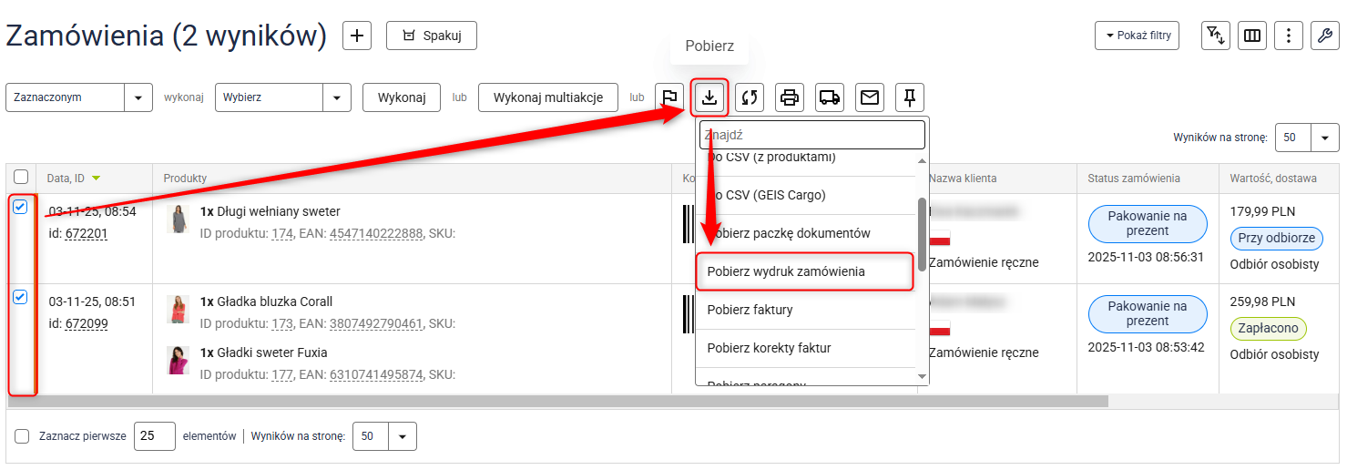 1. Z zakładki Zamówienia kliknij Zamówienia.2. Zaznacz zamówienia, dla których chcesz pobrać kody kreskowe. Kliknij Pobierz i z rozwijanej listy wybierz Pobierz wydruk zamówienia.