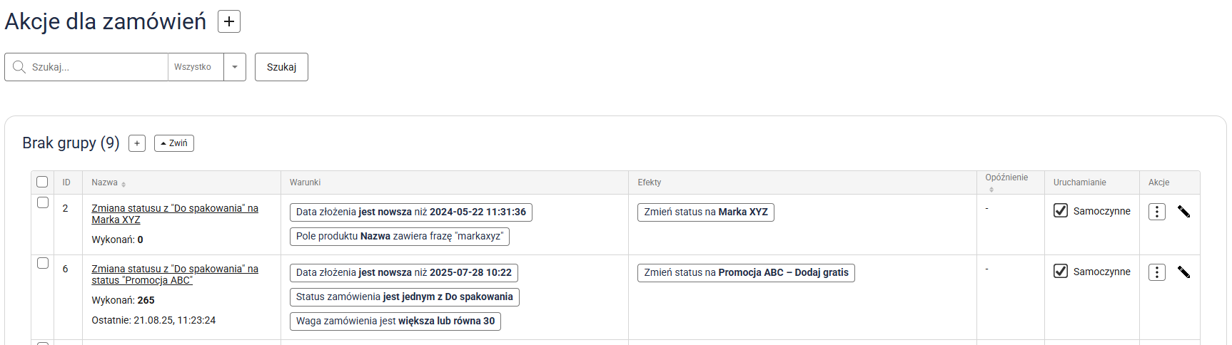 2. Aby po zebraniu produktów, w trybie pakowania zamówienia wpadały do odpowiedniego statusu (dla przykładu to: MarkaXYZ, PromocjaABC - dodaj Gratis, Gabaryt, Uwaga Szkło) trzeba utworzyć odpowiednie akcje automatyczne dla zamówień i sprecyzować dokładnie warunki dla określonej grupy zamówień, dla których będzie przypisany odpowiedni status: