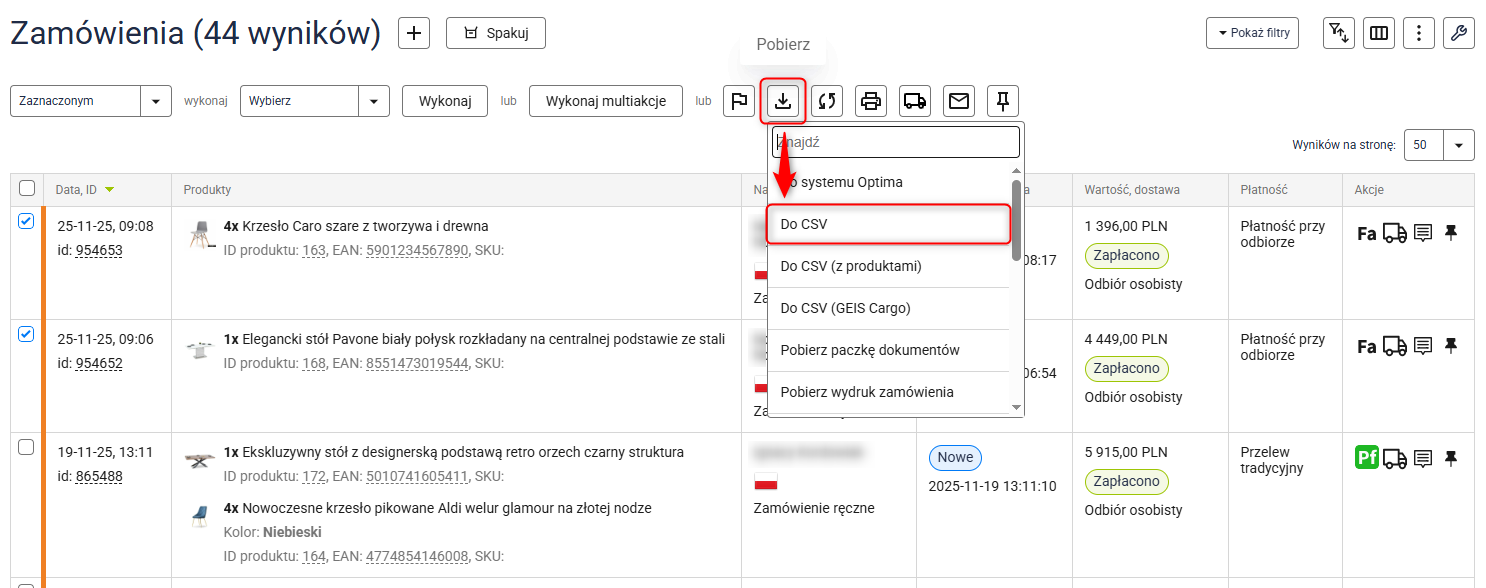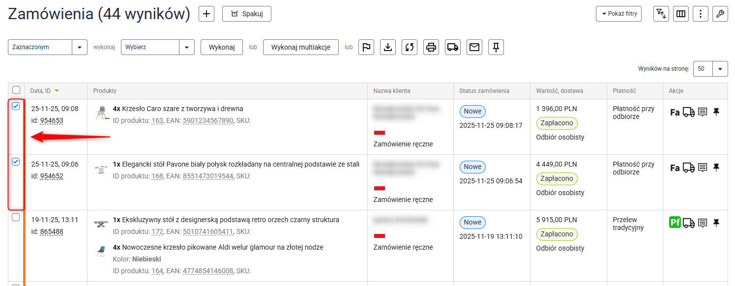 2. Zaznacz zamówienia przeznaczone do eksportu.