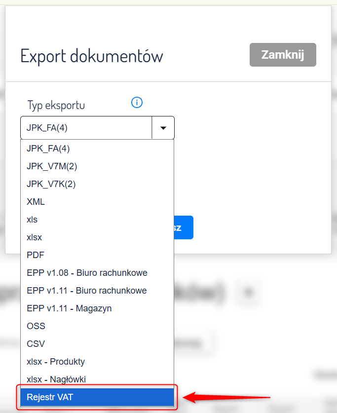 5. Wybierz format eksportu: Rejestr VAT.