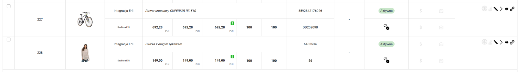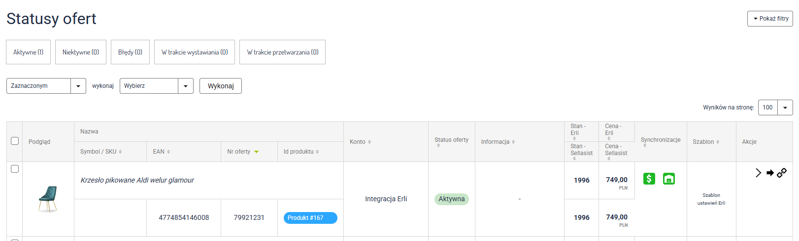 3. Poprawnie wystawione oferty pojawią się w Oferty → Erli i zmienią status na Aktywna (lub Nieaktywna — zależnie od statusu samej oferty). W zależności od specyfiki oferty, aktywacja może zająć od kilku do kilkunastu minut.