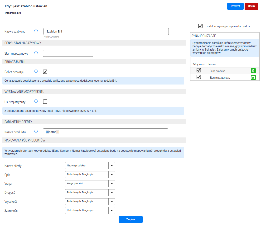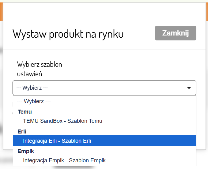 2. Na ekranie zobaczysz okno wyboru szablonu ustawień. Z rozwijanej listy wybierz Twój szablon Erli i kliknij przycisk Zapisz.