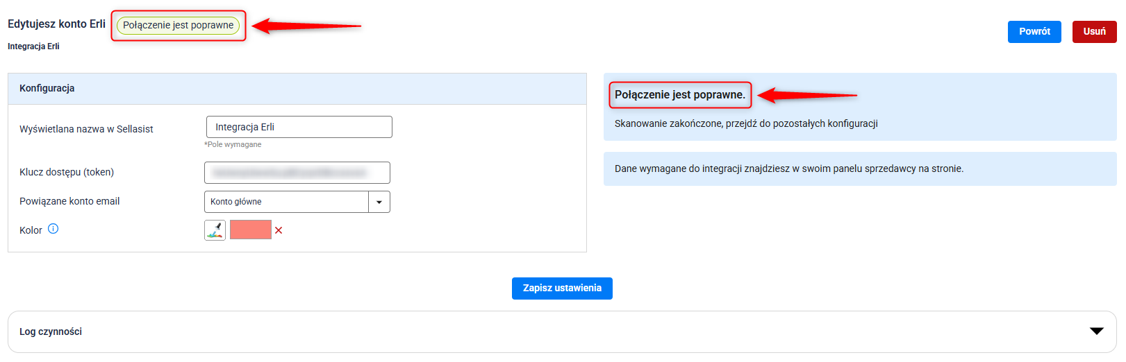 ikonę ołówka. Prawidłowo skonfigurowane konto będzie zawierać komunikat o poprawnym połączeniu (screen poniżej). Jeśli jeszcze nie podłączyłeś konta Erli lub nie skonfigurowałeś mapowania, szczegółową instrukcję konfiguracji znajdziesz