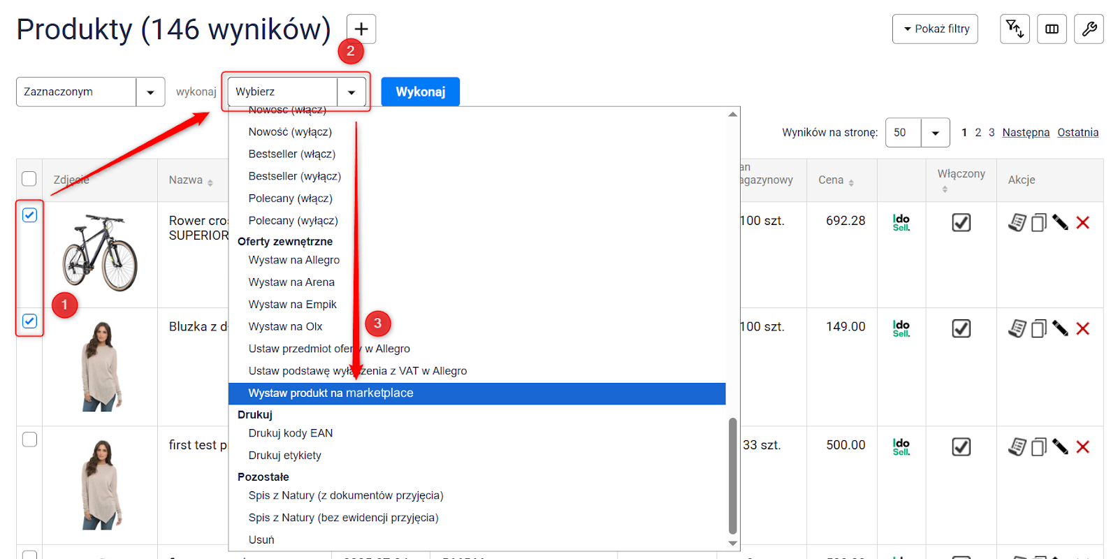 1. Przejdź do Asortyment → Produkty i zaznacz wszystkie produkty, które chcesz wystawić. Następnie z rozwijanej listy wybierz Wystaw produkt na marketplace i kliknij przycisk Wykonaj.