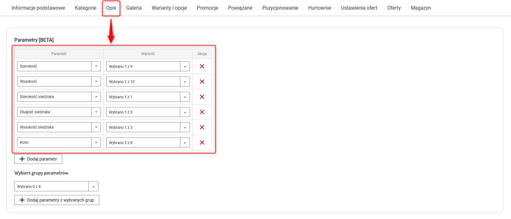 4. Przejdź do zakładki Opis i upewnij się, że produkt posiada zmapowane parametry.
