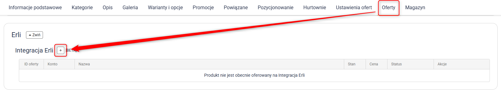 5. Przejdź do zakładki Oferty i w sekcji ofert Erli kliknij przycisk z ikoną plusa.