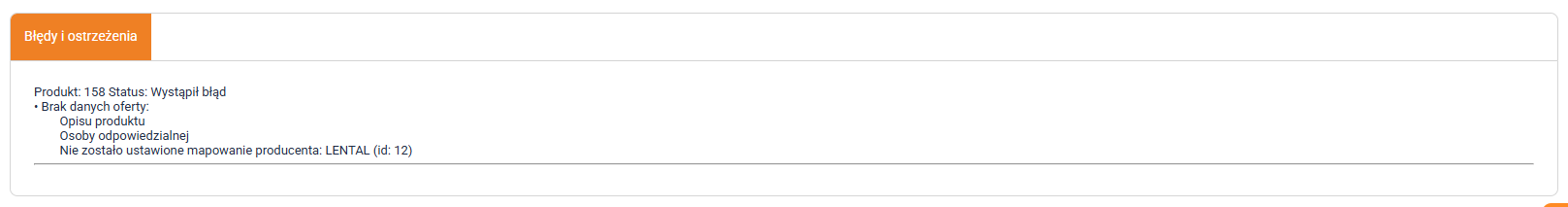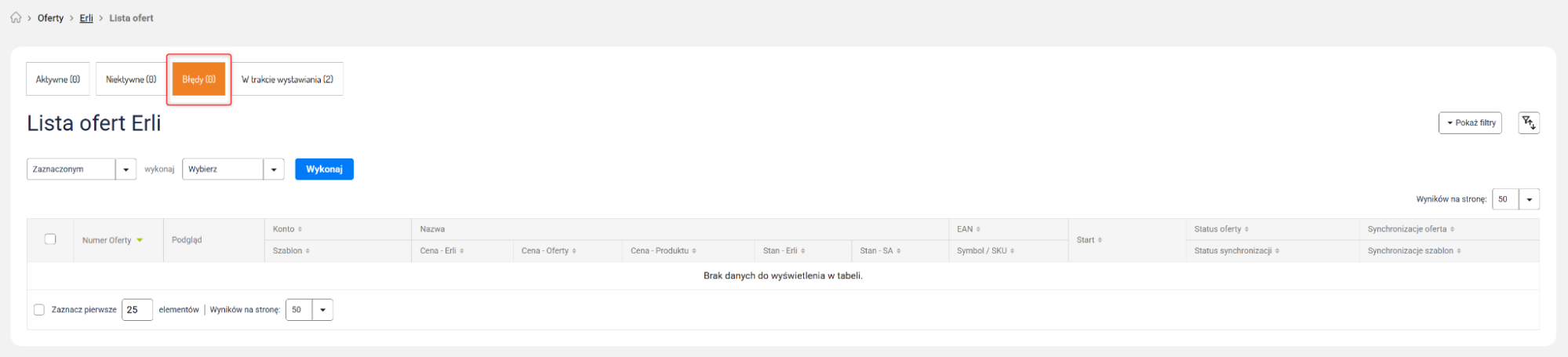 4. Jeśli z jakiegoś powodu oferta nie zostanie wystawiona, szczegóły zdarzenia znajdziesz w zakładce Błędy. Po wprowadzeniu wymaganych zmian, możesz ponowić wystawianie każdej takiej oferty.
