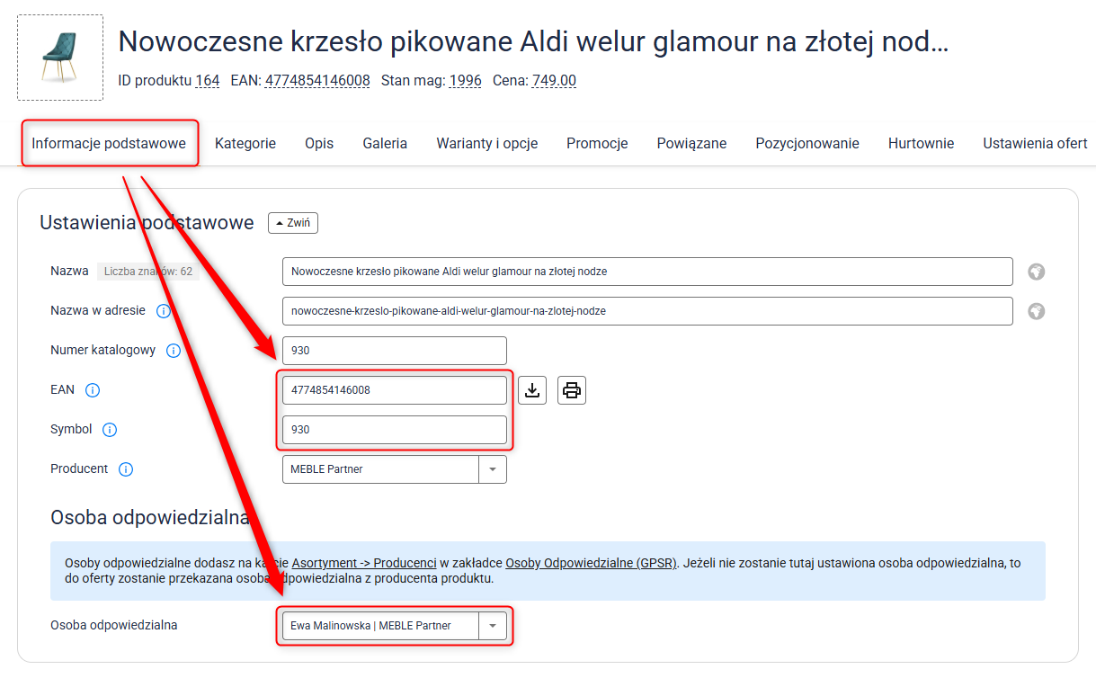 2. Przejdź do zakładki Informacje podstawowe i upewnij się, że przedmiot posiada uzupełnione pola Kod EAN-13, Symbol i Osoba odpowiedzialna.