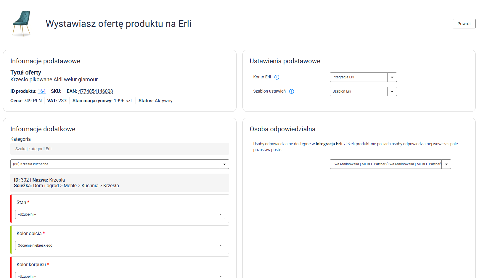 W tej sekcji skonfigurujesz dodatkowe parametry produktu dostępne w ramach wybranej kategorii Erli. Możesz wyszukać i przypisać do produktu dowolną kategorię. Poniżej parametrów znajduje się przypisany producent oraz osoba odpowiedzialna.