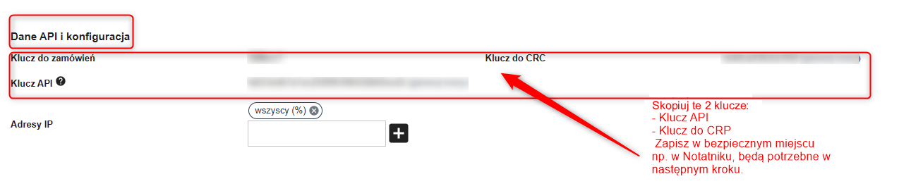 4. Skopiuj Klucz do CRP oraz Klucz API i zapisz w bezpiecznym miejscu, np. w Notatniku. Te dane będą potrzebne w kolejnym kroku integracji.