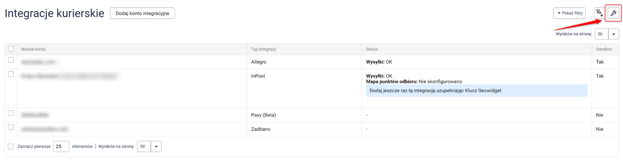 1. Przejdź do zakładki Integracje ⇨ [Nowe] Integracje kurierskie i kliknij ikonę klucza.