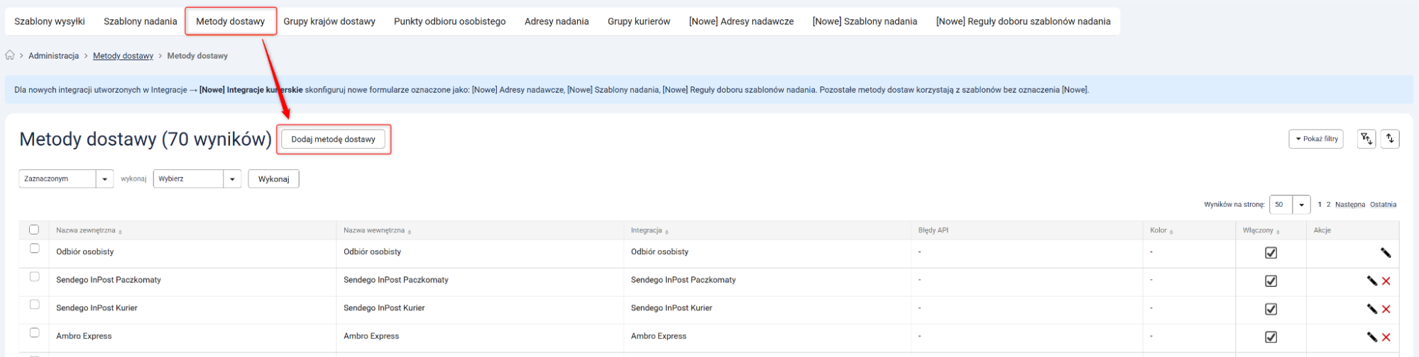 1. Przejdź do zakładki Administracja ⇨ Metody dostawy i kliknij Dodaj metodę dostawy.