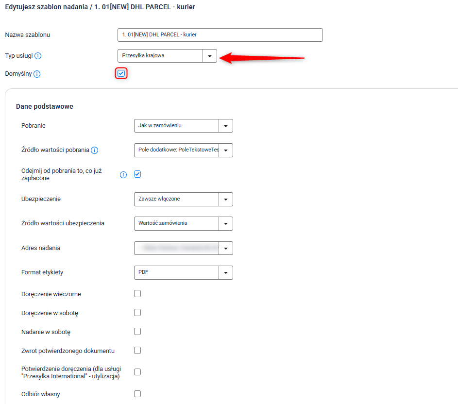 Adres nadania – wybierz adres, z którego będą wysyłane przesyłki.