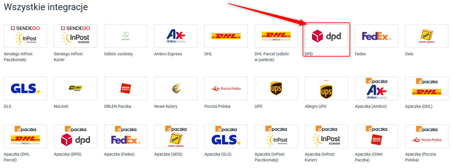 2. Przejdź do Integracje ⇨ [Nowe] Integracje kurierskie i wybierz DPD.