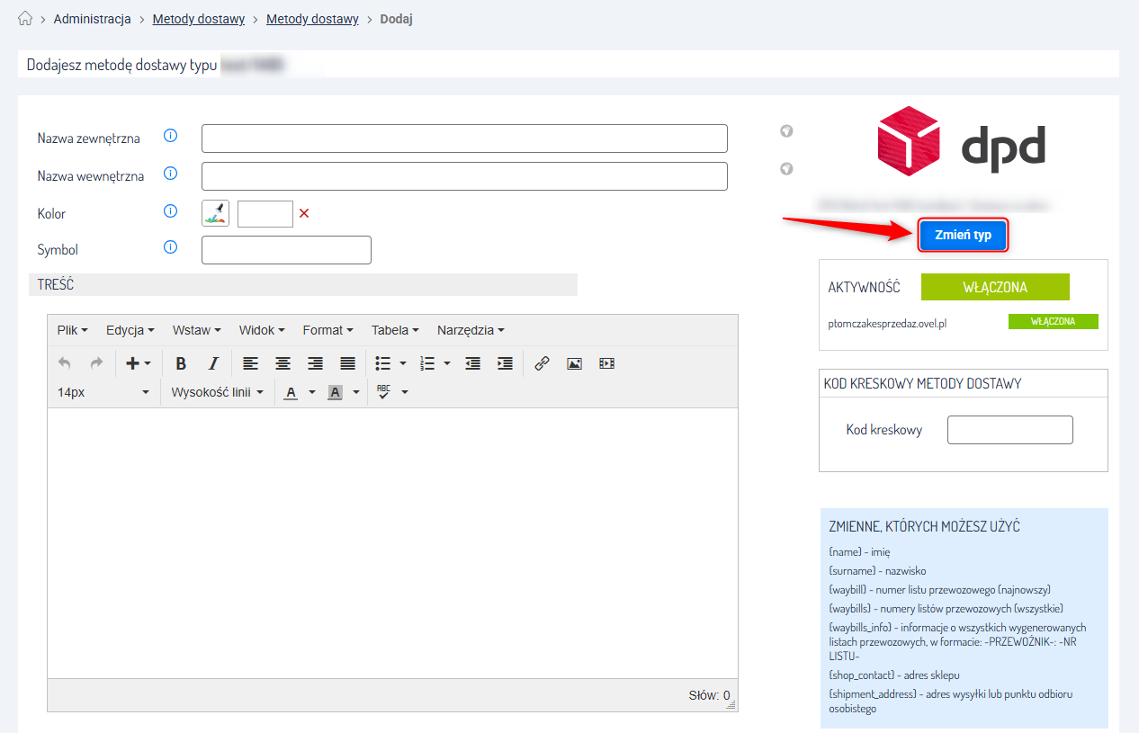 Nazwa szablonu – nadaj szablonowi unikalną nazwę, aby łatwo go było rozpoznać (np. DPD - odbiór w punkcie).