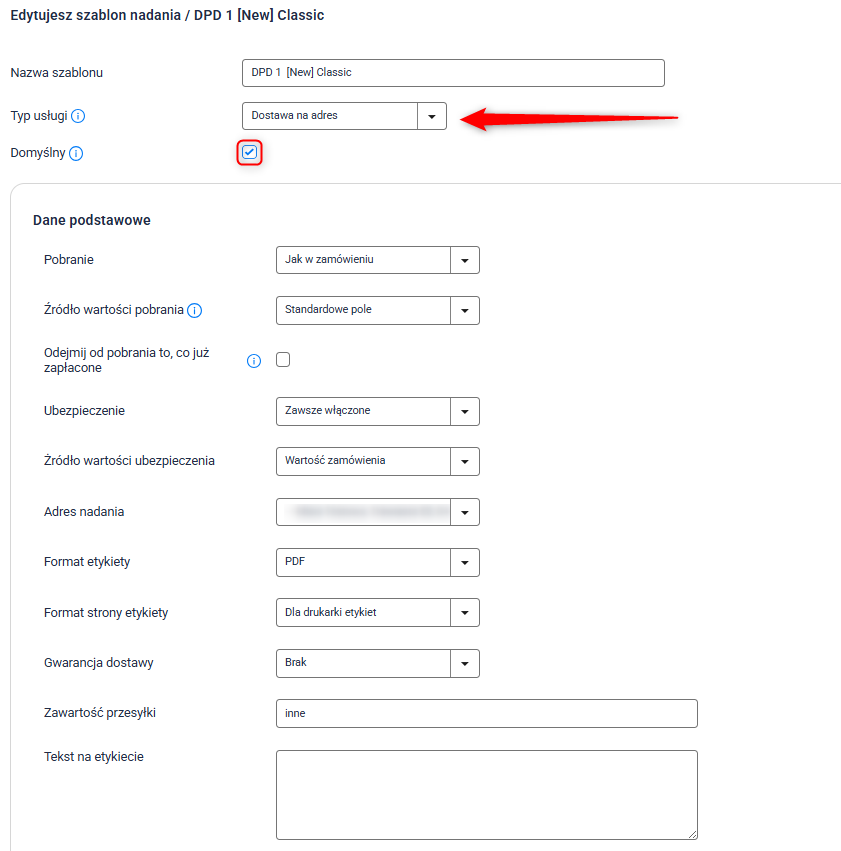 Ustawienia szablonu nadania dla DPD