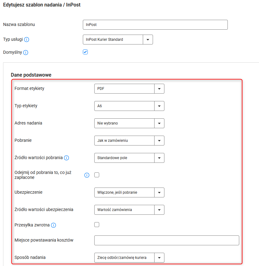 UWAGA: Możesz utworzyć osobne szablony nadania dla każdego konta InPost lub stworzyć je tylko na jednym koncie. Szablony utworzone dla danego konta będą dostępne także dla pozostałych kont w ramach tej samej integracji.