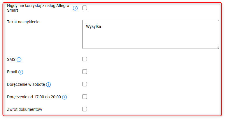 Nigdy nie korzystaj z usług Allegro Smart – po zaznaczeniu tej opcji zamówienia z Allegro nigdy nie będą przesyłane do usługi InPost jako Smart. Ta opcja będzie wygodnym rozwiązaniem, gdy korzystasz wyłącznie z umowy własnej.