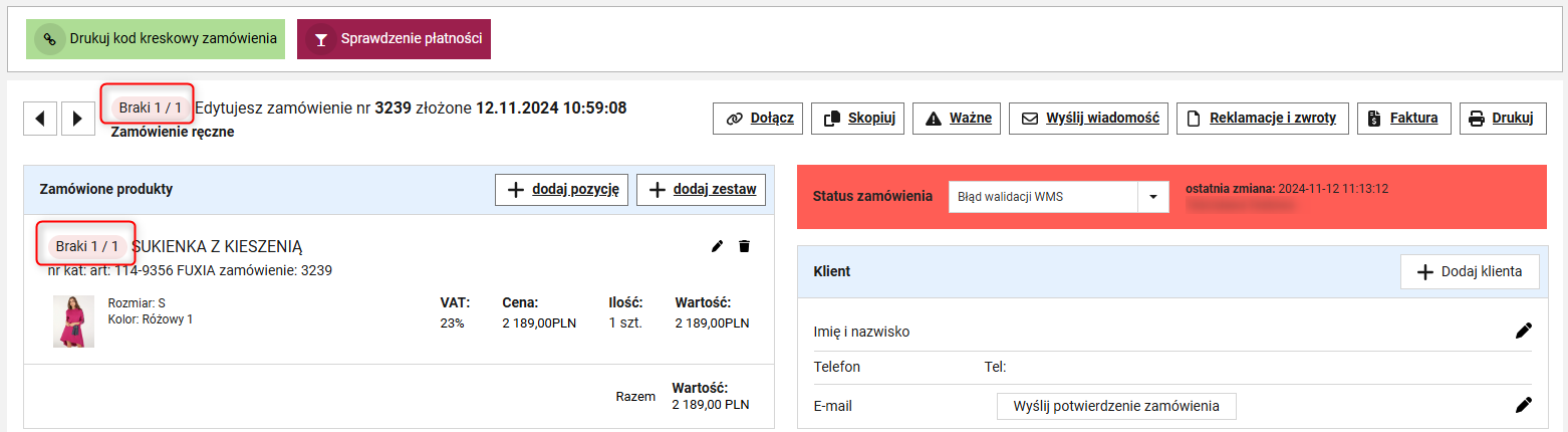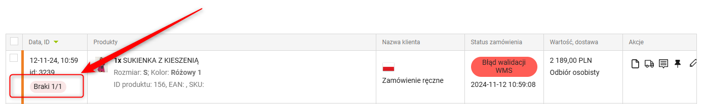 W panelu Sellasist zamówienie zostanie oznaczone jako "Braki"
