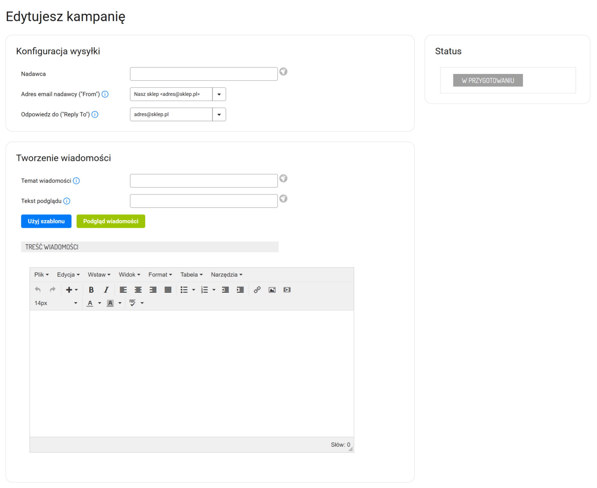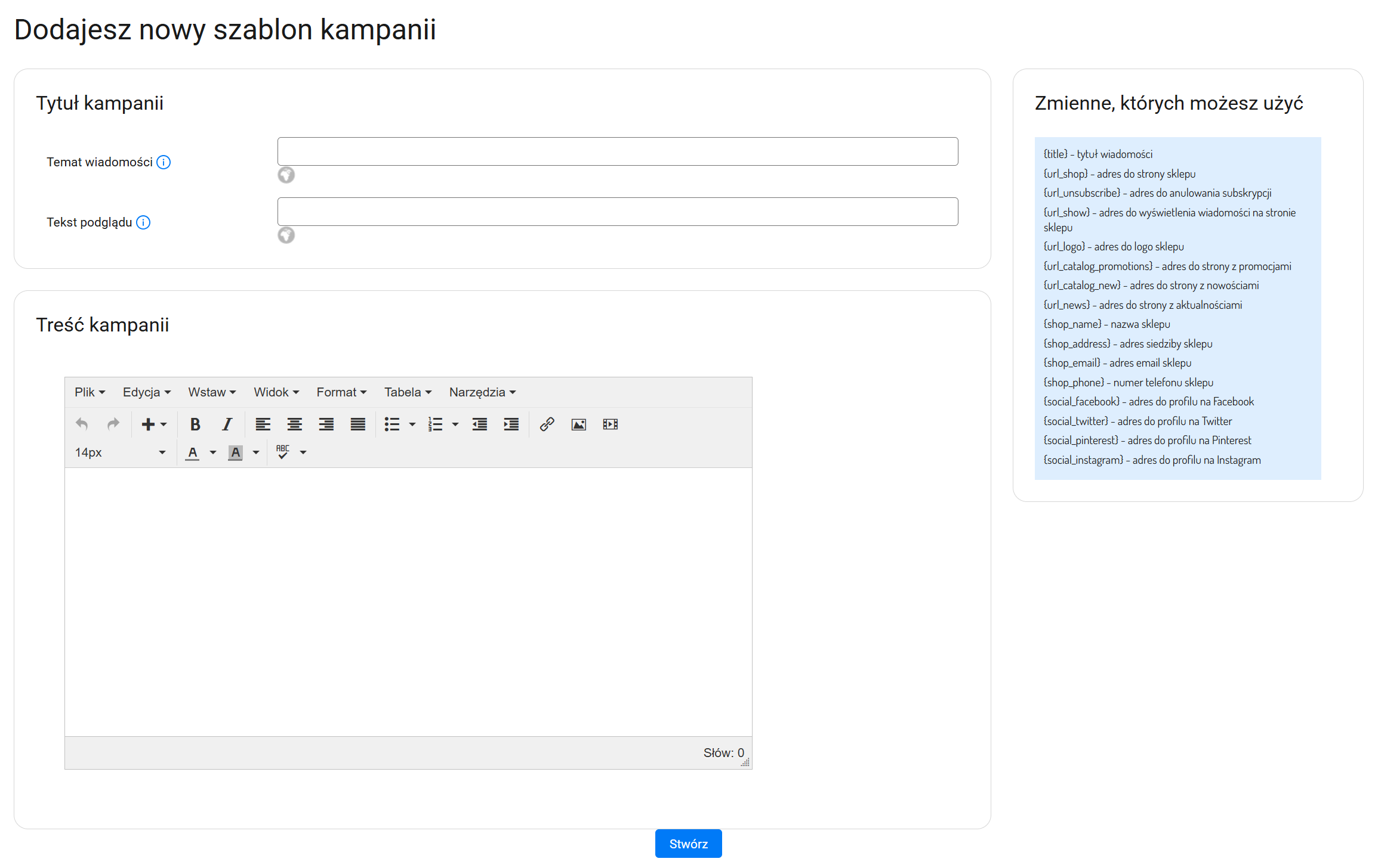 Uzupełnij temat wiadomości, tekst podglądu oraz treść szablonu.