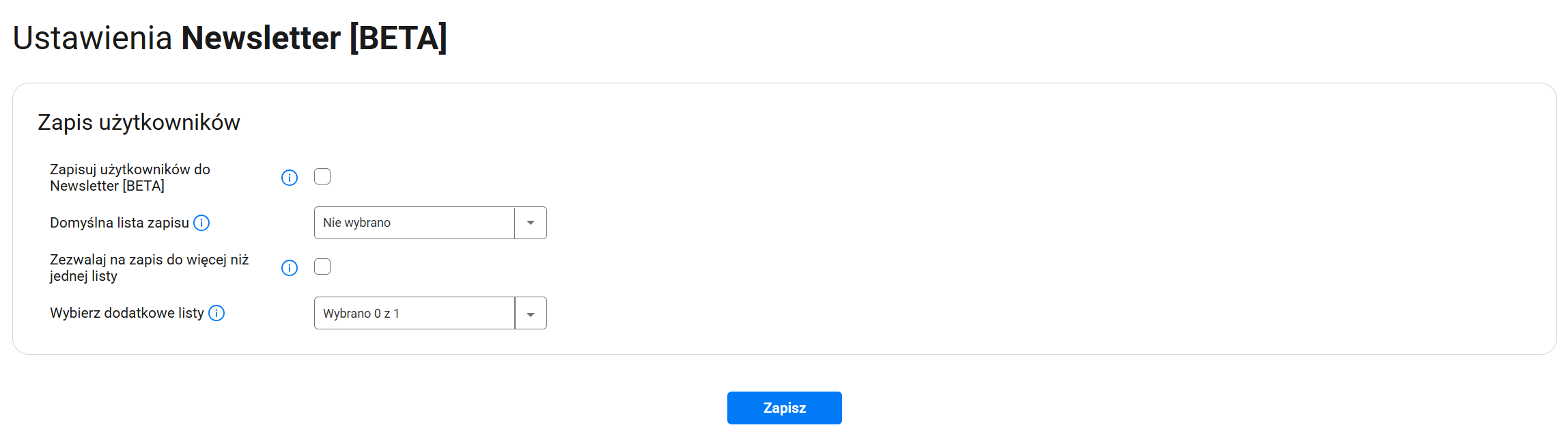 • Zapisuj użytkowników do Newsletter [BETA]: Opcja dostępna podczas korzystania z nowego modułu newslettera w wersji Beta. Umożliwia określenie, czy kontakty zapisywane w systemie mają być automatycznie dodawane do list odbiorców w nowej integracji mailingowej.