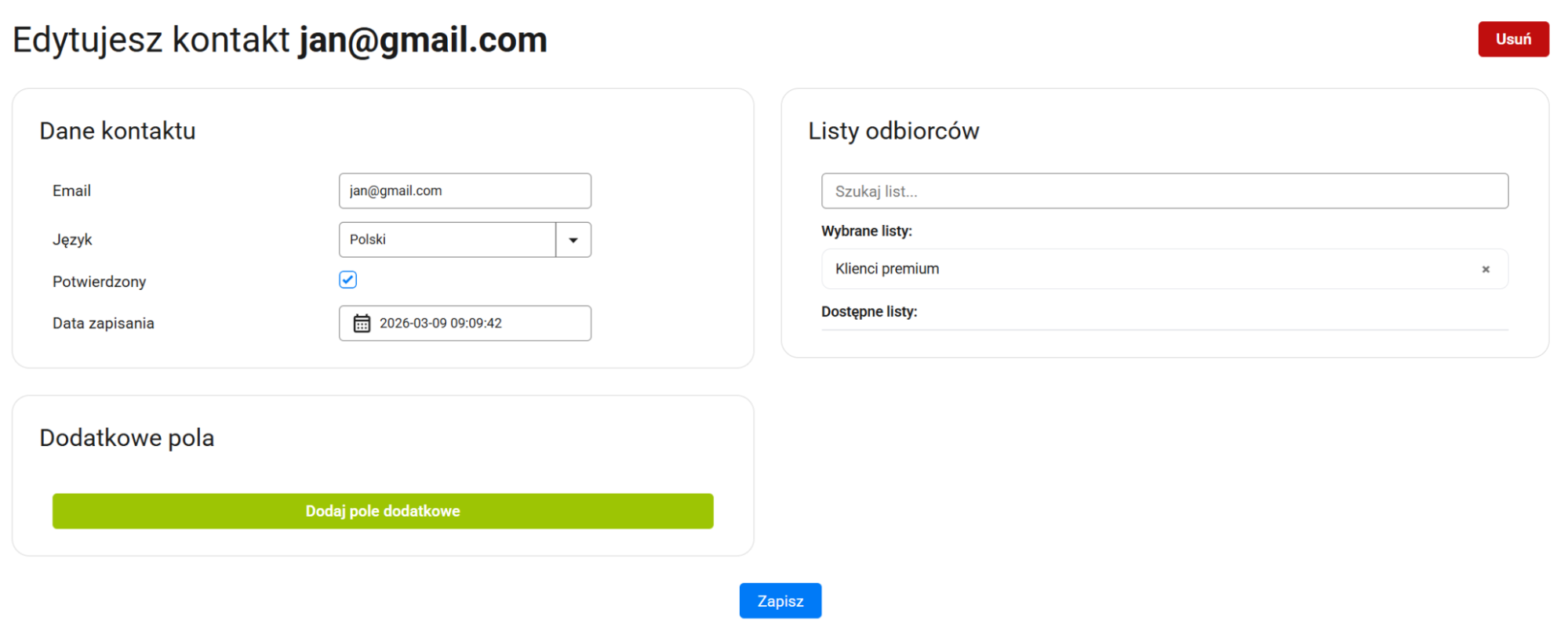 • Sekcja Listy odbiorców: Możliwość przypisania kontaktu do wcześniej utworzonych grup odbiorców