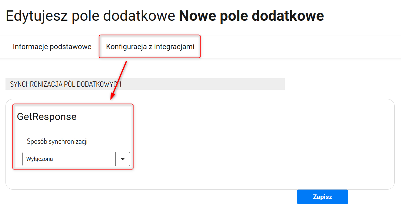 4. Po zapisaniu zmian, pojawi się nowa zakładka — Konfiguracja z integracjami. Tutaj możesz ustawić sposób synchronizacji danego pola z Twoim systemem mailingowym.