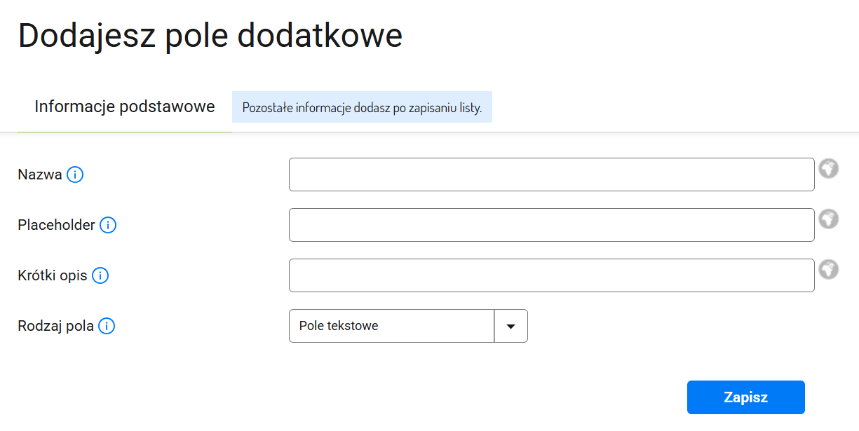 2. Na ekranie zobaczysz formularz tworzenia nowego pola dodatkowego.