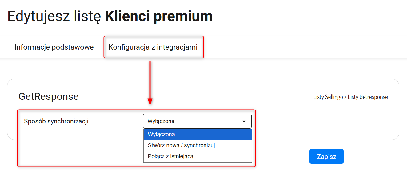 4. Po zapisaniu zmian pojawi się nowa zakładka — Konfiguracja z integracjami — w której ustawisz sposób synchronizacji listy z wybraną integracją mailingową.