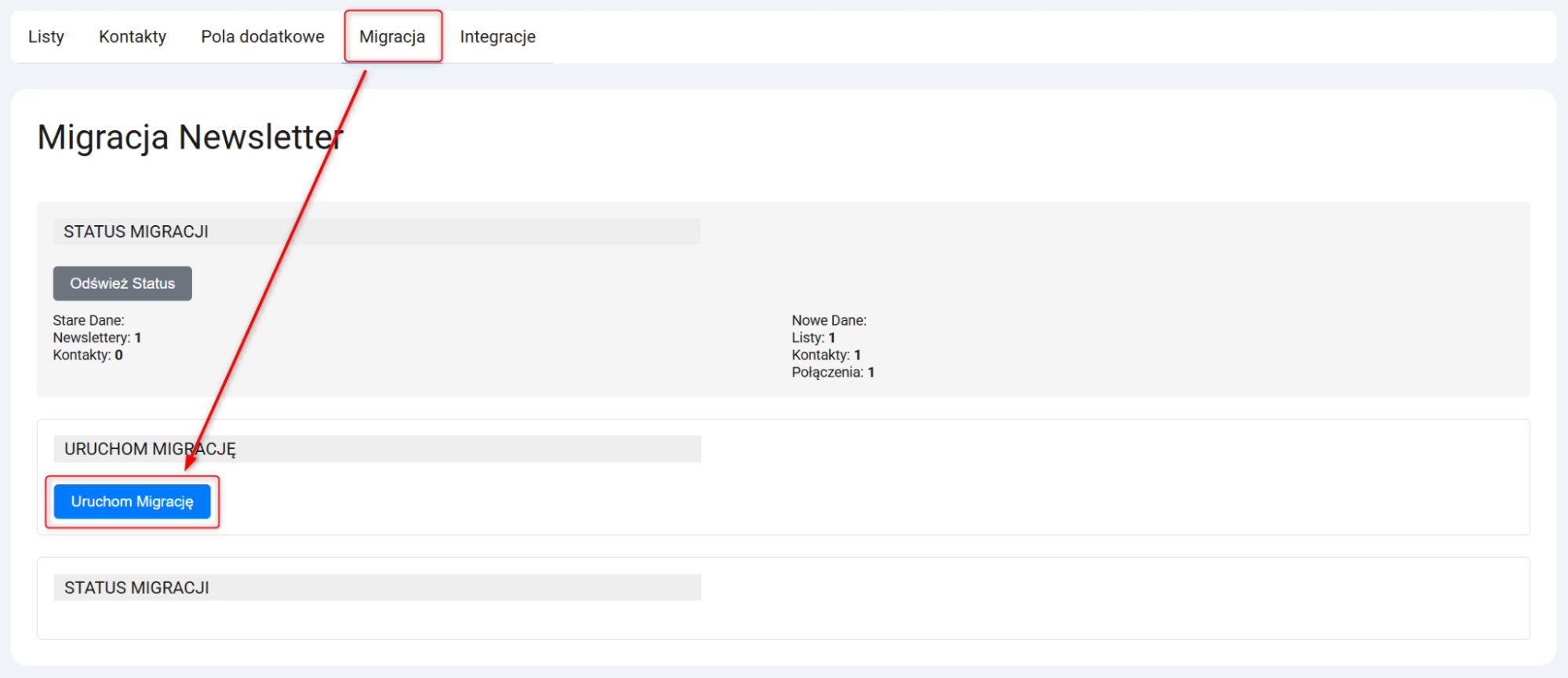 1. Przejdź do Marketing [BETA] → Kontakty → Migracje i kliknij przycisk Uruchom Migrację.