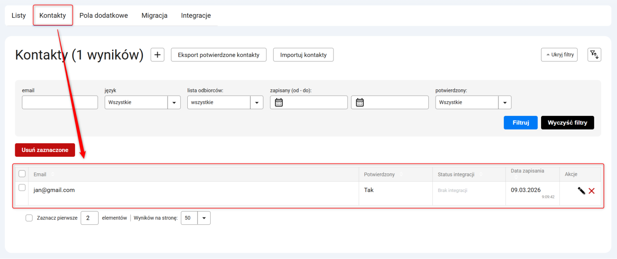 Zakładka Kontakty umożliwia pełne zarządzanie bazą subskrybentów newslettera. Wszelkie zmiany wprowadzisz, przechodząc na listę kontaktów: Marketing [BETA] → Kontakty → Kontakty.