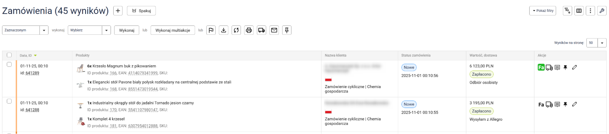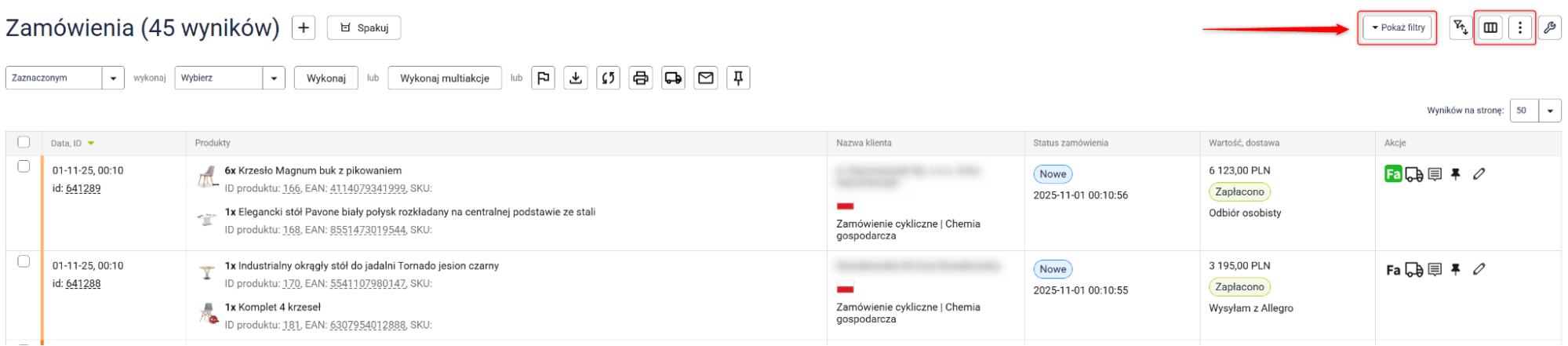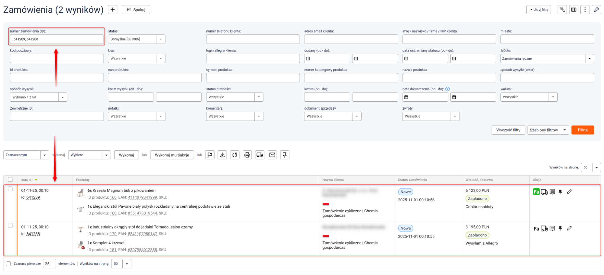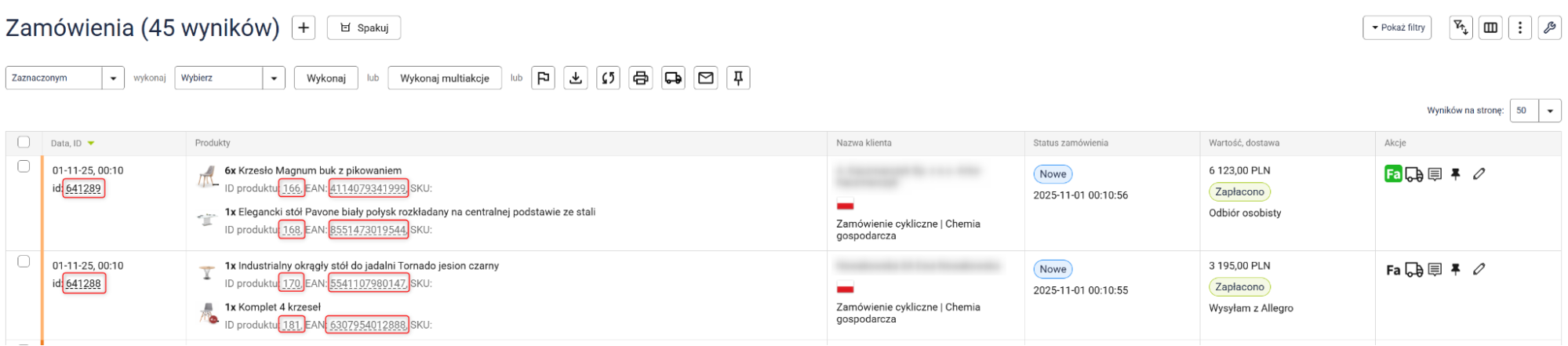 - Filtrowanie danych przy użyciu przecinka (np. nr zamówienia, produkt, zewnętrzne ID).