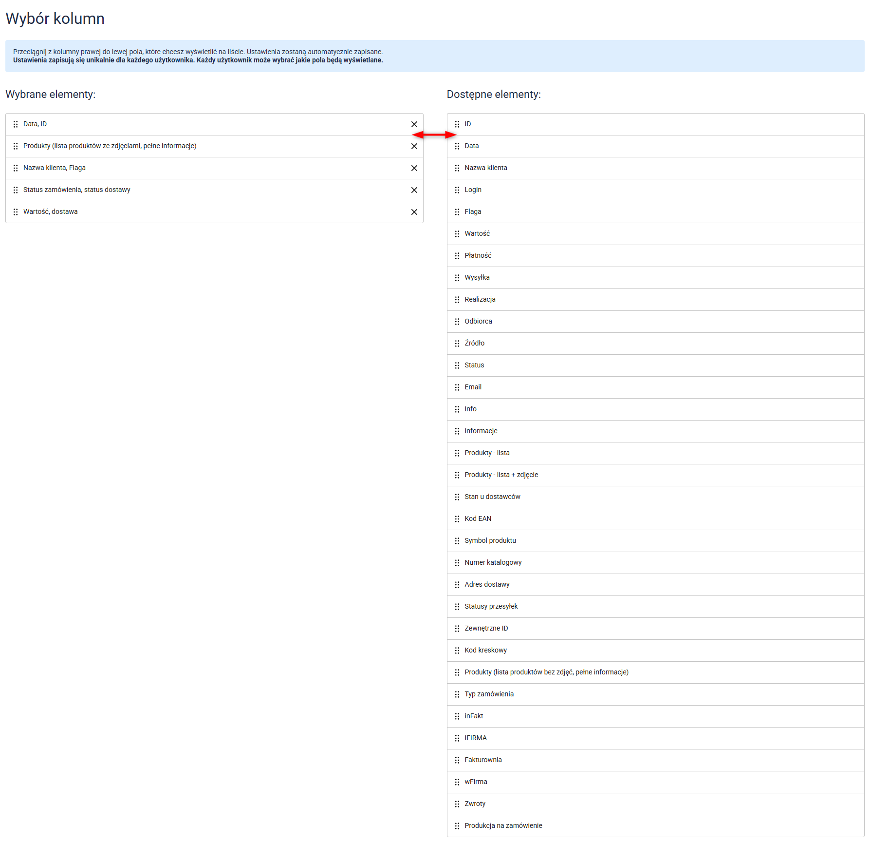 Przeciągnij z kolumny prawej do lewej pola, które chcesz wyświetlić na liście. Ustawienia zostaną automatycznie zapisane.