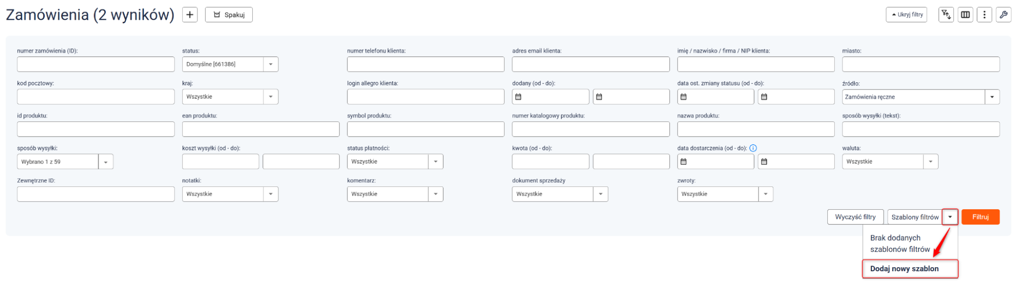Ta nowa funkcja pozwala użytkownikowi na stworzenie wielu szablonów do konkretnych potrzeb. Szablony mogą mieć różne parametry, po których filtrowane będą zamówienia. By utworzyć szablon: