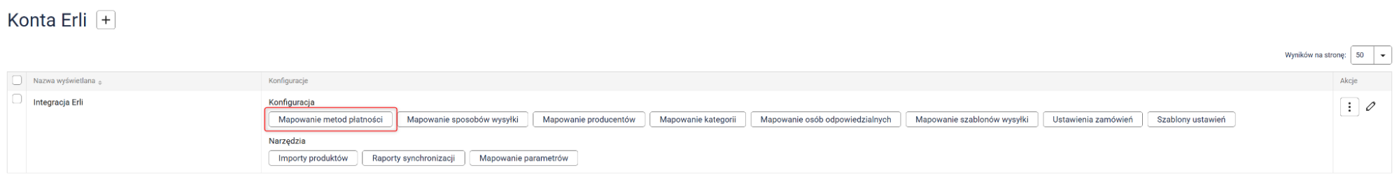 1. Przejdź na kartę integracji danego marketplace lub sklepu, dla którego chcesz zmapować metody płatności (Integracje → Wybrana integracja) i kliknij przycisk Mapowanie metod płatności.
