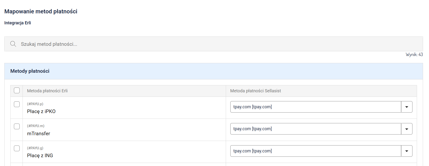 2. Na ekranie zobaczysz formularz z dwiema kolumnami: Metoda płatności w integracji i Metoda płatności w Sellasist. Z rozwijanej listy w kolumnie Sellasist wybierz metody płatności, które chcesz przypisać dla poszczególnych metod znajdujących się na marketplace czy w sklepie.