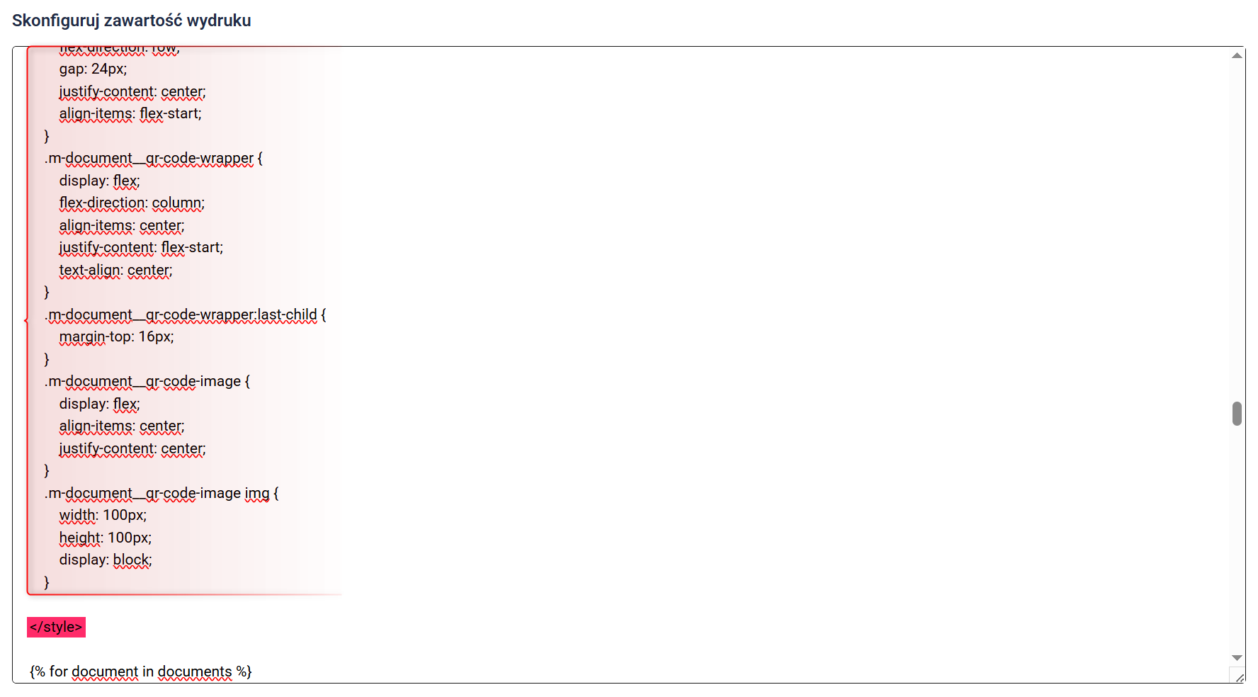 5. W oknie Skonfiguruj wydruk zobaczysz kod wybranego szablonu. W razie potrzeby, w tym miejscu możesz edytować kod (więcej o tym w następnej sekcji), a następnie zapisać gotowy szablon, klikając przycisk Zapisz.