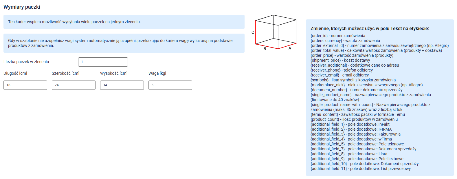 Aby skorzystać z tej funkcji, zmień wartość w polu Liczba paczek w zleceniu i uzupełnij dane dla poszczególnych paczek.