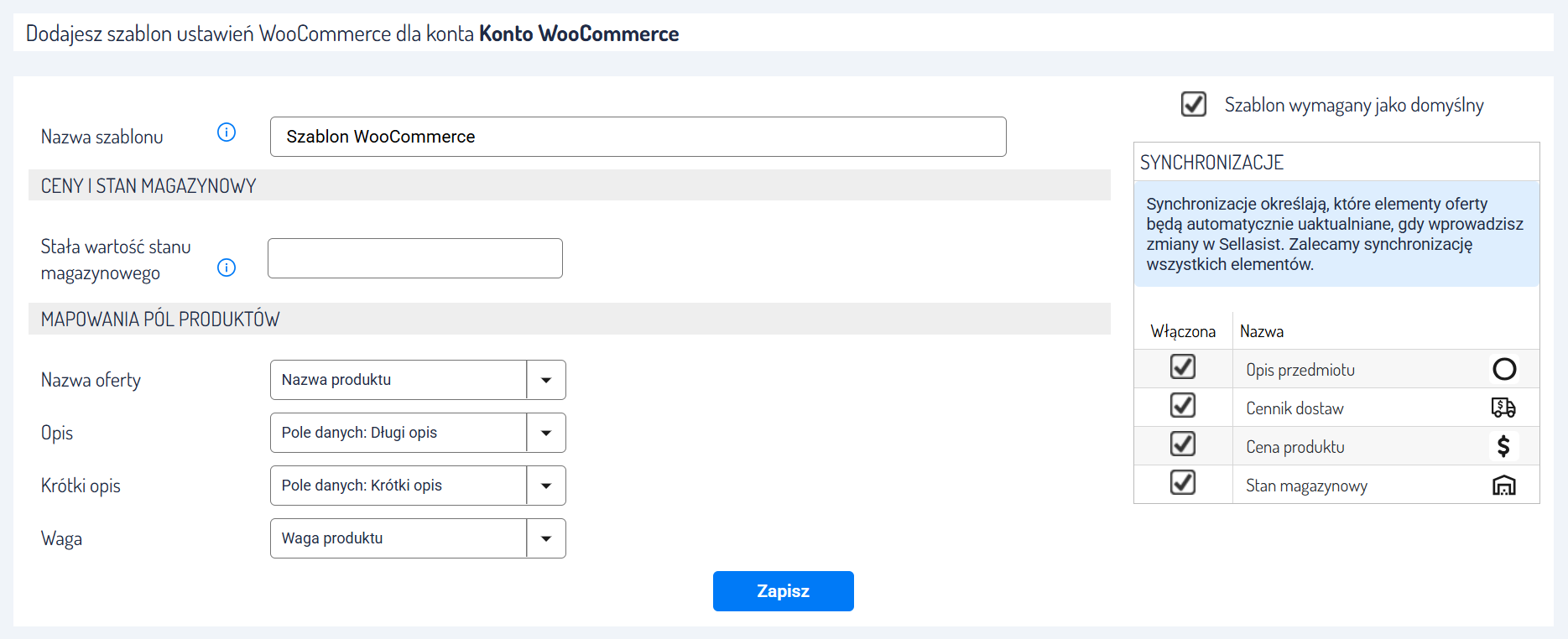 • Synchronizacje: Określają, które elementy oferty będą automatycznie aktualizowane przy wprowadzeniu zmian w Sellasist. Zaleca się synchronizację wszystkich elementów.