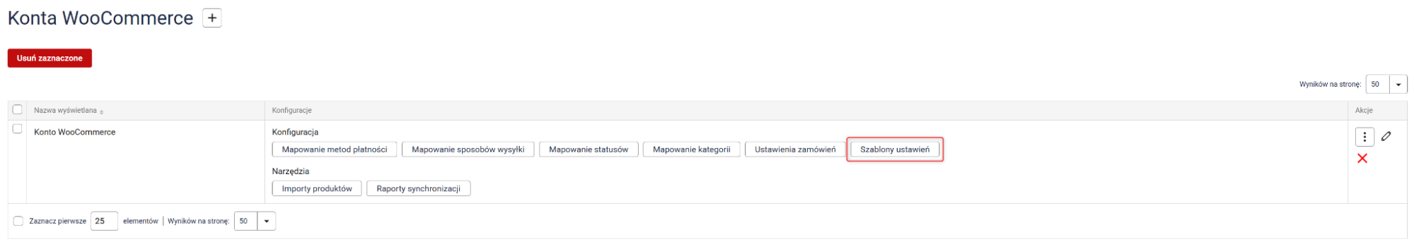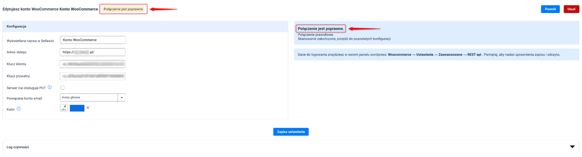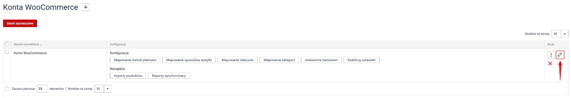 Zanim zaczniesz: Upewnij się, że integracja WooCommerce jest poprawnie podłączona, a wszystkie ustawienia mapowania właściwie skonfigurowane. Aby sprawdzić status integracji, przejdź do Integracje → WooCommerce i kliknij ikonę ołówka. Prawidłowo skonfigurowane konto będzie zawierać komunikat o poprawnym połączeniu (screen poniżej). Jeśli jeszcze nie podłączyłeś konta WooCommerce albo nie skonfigurowałeś mapowania, szczegółową instrukcję znajdziesz tutaj.