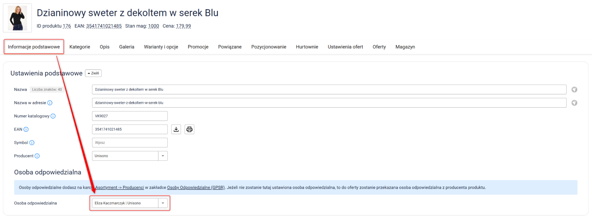 2. Na karcie produktu przejdź do zakładki Informacje podstawowe i upewnij się, że wskazałeś osobę odpowiedzialną za produkt (dyrektywa GPSR). Aby dowiedzieć się więcej na temat ustawień GPSR, kliknij w wybrany temat: Osoby Odpowiedzialne, Instrukcje Bezpieczeństwa.