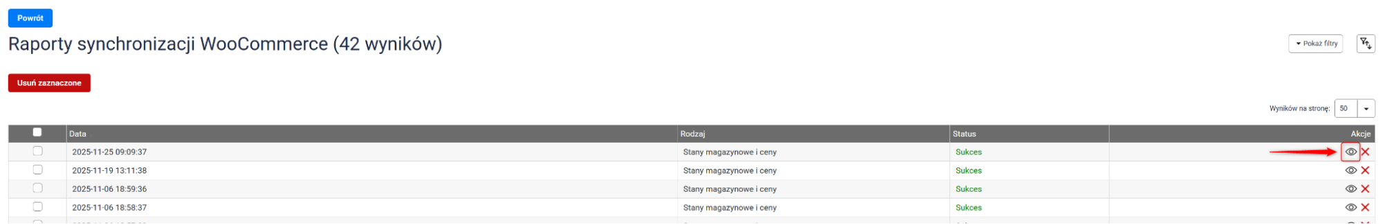 Jeśli z jakiegoś powodu oferta nie zostanie wystawiona albo system napotka inne przeszkody, szczegóły takich zdarzeń znajdziesz w Integracje → WooCommerce → Raporty synchronizacji → ikona podglądu.