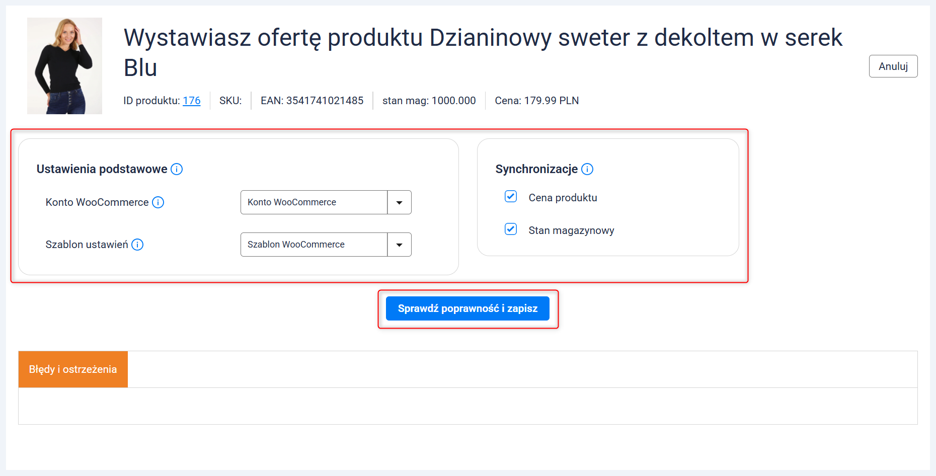 4. Na ekranie zobaczysz formularz wystawiania oferty. W sekcji Ustawienia podstawowe wybierz konto i szablon, które chcesz przypisać do tej oferty, a w sekcji Synchronizacje zdecyduj, czy chcesz synchronizować ceny i stan magazynowy produktu w ofercie. Następnie kliknij przycisk Sprawdź poprawność i zapisz.